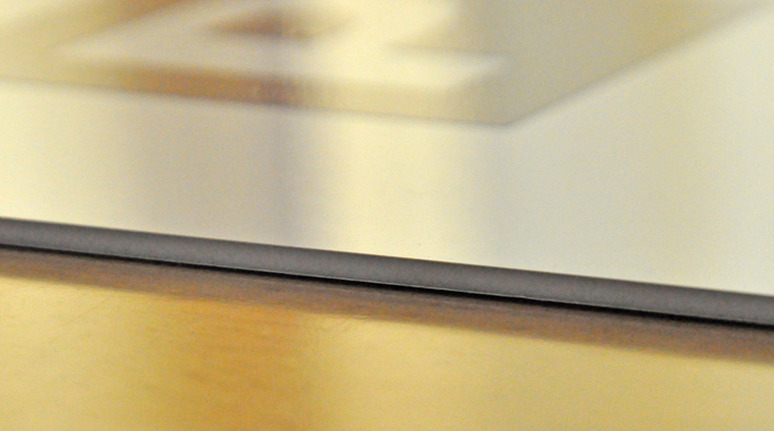 このドア・プレートは、3mmの透明アクリルの裏側から印刷したもので、サイズは650mm×610mmと少々大きめ。なぜ裏側から印刷するのかとゆーと、表側に光沢のある透明層がくると、高級感が出たり雰囲気が良くなるからって理由です。印刷面の摺り傷防止って意味もありますけどね。