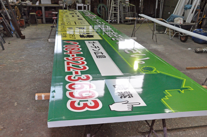 幅が8mもある看板なので、施工当日は2分割で現場に輸送します。