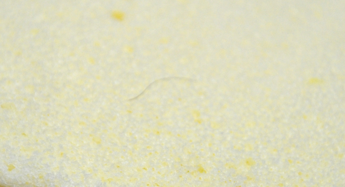 実は昨日、ウチの相方さんと一緒に、先日の京都土産の和菓子をいただいていた時のこと。封を開けると写真の通り「毛ゴミ」が付着していました。