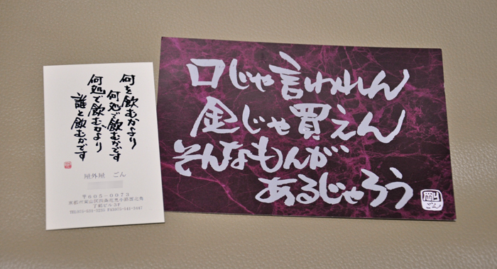 名刺にも語録が入っているのですが、このひとこと、酒飲みの心をとらえていて、いい言葉ですね(^人^)