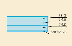 液晶フィルターは、画面に貼り付けて使いますが、3枚全てが同じ吸着力だと、はがす時に3枚一気にごっそりはがれてしまう。とゆーことは、上から順番に吸着力を強くしていかなきゃならない。つまり、3種類の素材を使用しているってわけです。