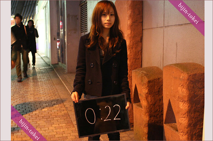 手書き時刻の入ったパネルを持った美女の街角写真が、