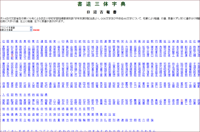 このサイトでは、小学校で習う教育漢字1,006文字とひらがな46文字を、毛筆で楷書・行書・草書(くずし字)に書き分けています。こんな感じ↓